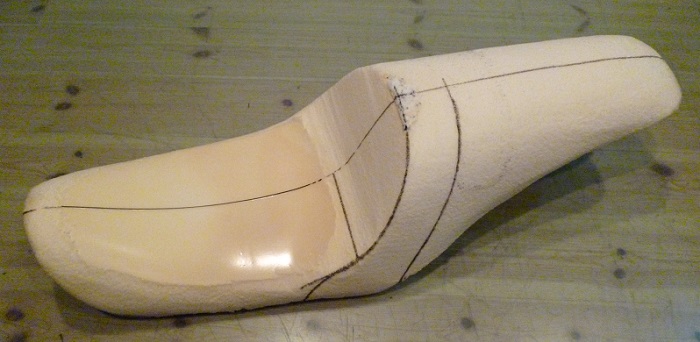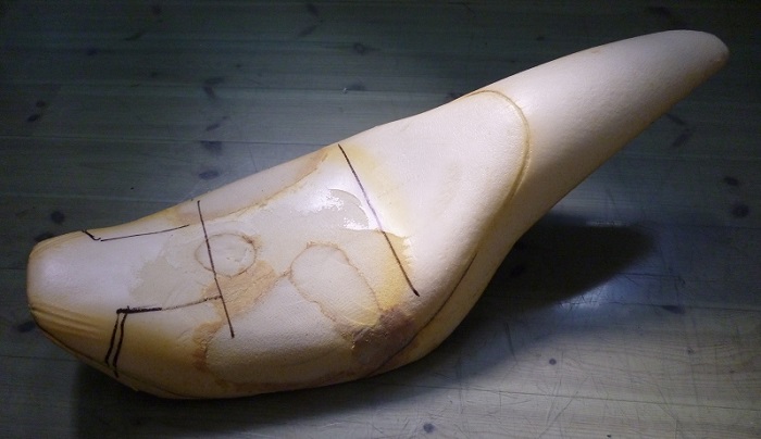 ウレタンをガンファイター形状に加工後、表皮の型取り〜裁断〜縫製に入ります。