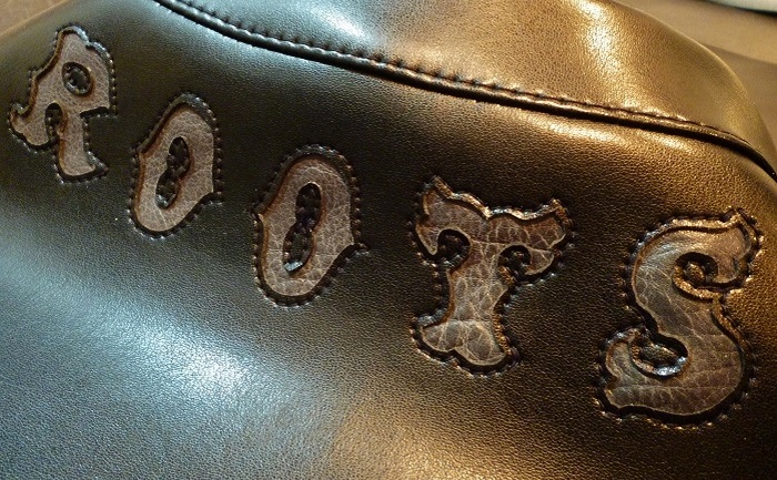 完成! こちらも素材は人工皮革、リヤ側に「ROOTS」のロゴをグレーの本革で刻みました。