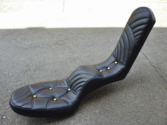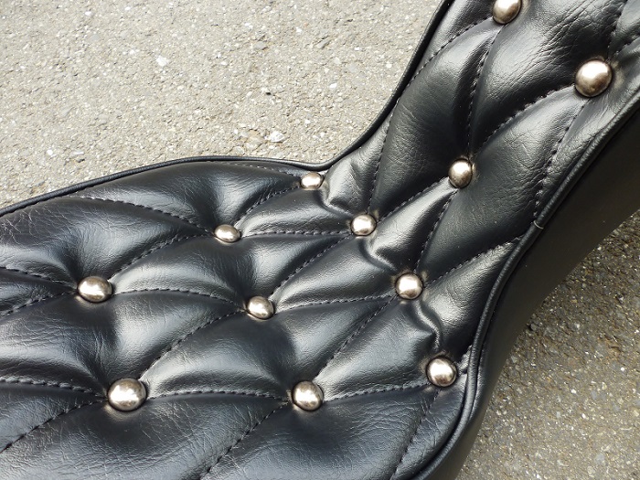 素材はハードライドオリジナル合皮、半球のガンメタボタンを深めに沈めてムチムチ感を強調しました。