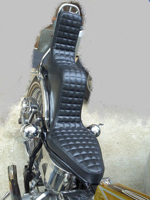 表皮はハードライド合皮、全面ブロックキルトのハイバックシートです。 左側にポケットを付け、70年代当時を彷彿させるシートになりました。