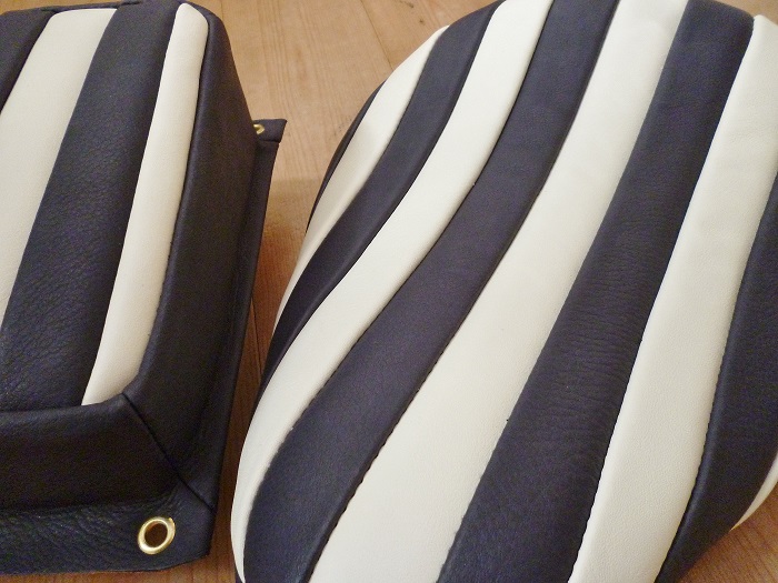 贅沢にも2種類の革を使用し、白(牛革)×紺(水牛革)にて往年のBATESシートを再現しました。