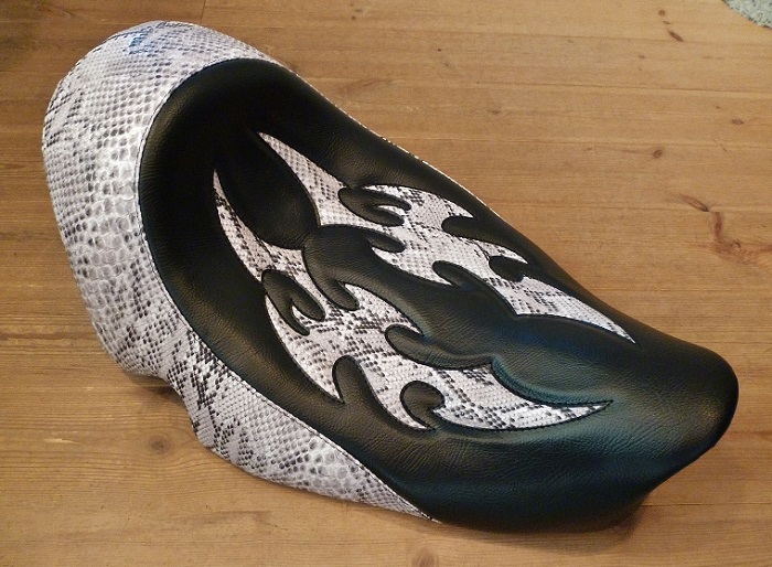 黒(合皮) × 白ヘビ(合皮) 座面にトライバル模様を刻みました! こちらも個性的ですね!