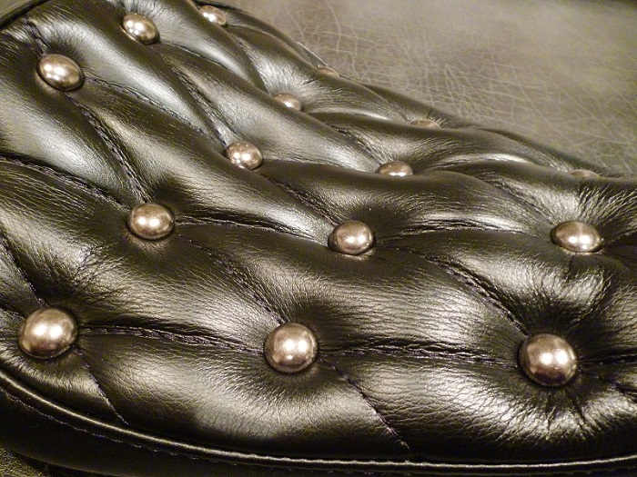 本革張り! ダイヤステッチに半球のガンメタボタンを沈めムチムチ感を強調しました。