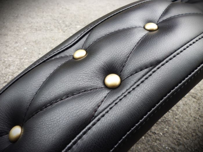 上質な牛革にアンティークゴールドの半球ボタンを沈め高級感とムチムチ感を強調しました。
